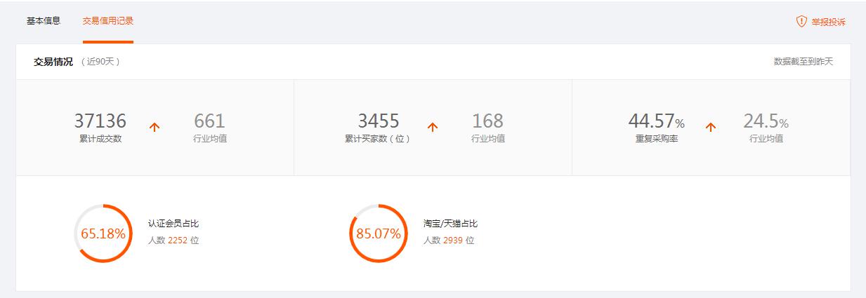 说到六项交易信用记录包括我们的累计成交数、累计买家数、重复采购率、近90天退款率、近90天投诉率、近90天纠纷率。在这六项指标下面,我们还可以参考到同比行业均值,帮助我们去分析这家店铺是高于行业水准还是低于行业水准。